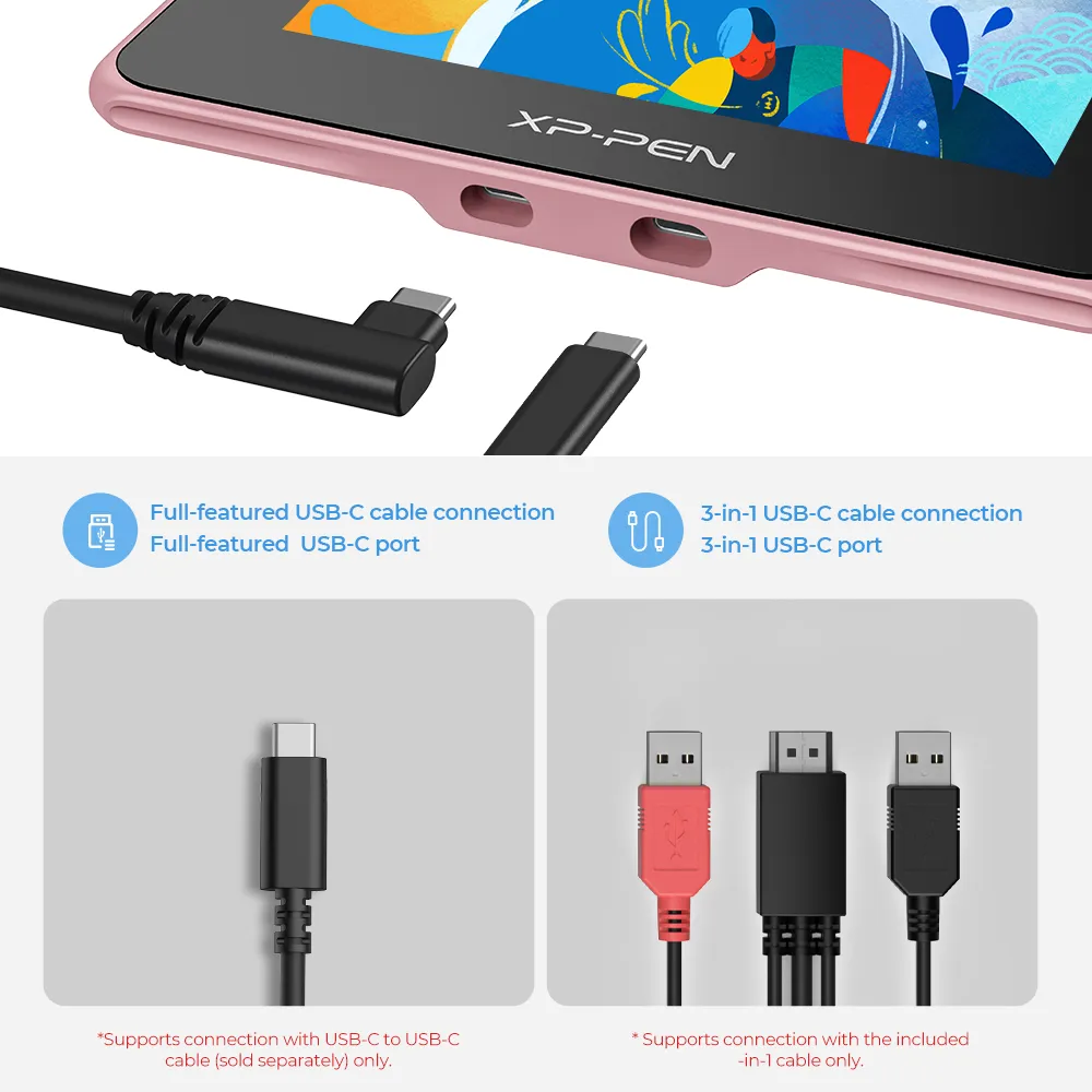 The 3-in-1 cable that supports HDMI signal transmission allows you to connect the drawing display to a PC. The full-featured USB-C port makes connection easier with devices such as PCs, Android phones, and Switch, allowing for a tidy desktop.